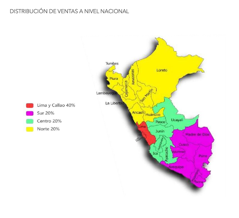 Disponemos de una extensa red de distribución que abarca todo el país, distribuida de la siguiente manera: 40% en Lima y Callao, 20% en el Norte del Perú, otro 20% en